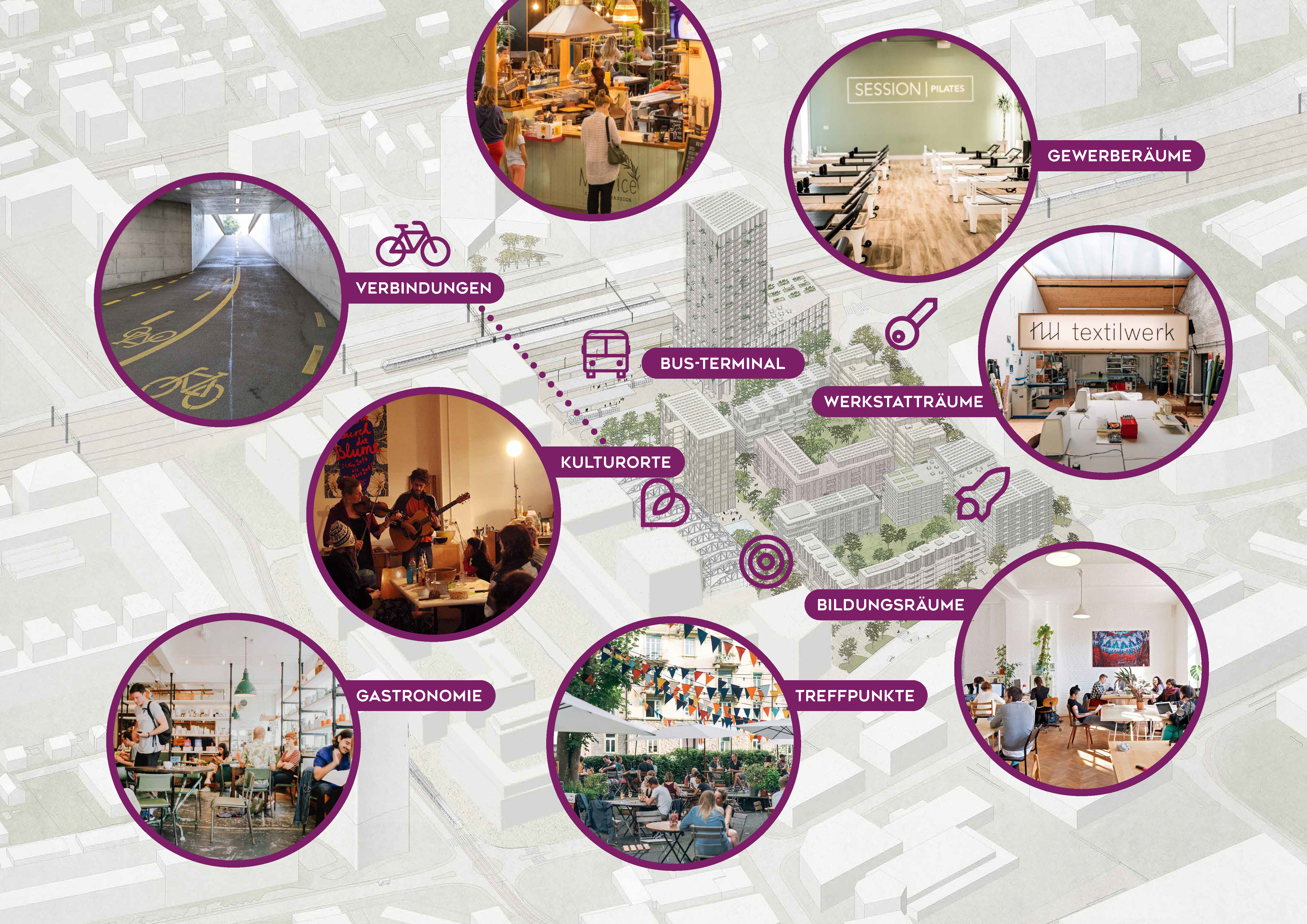 Ergänzt wird das Angebot durch unterschiedliche Quartierplätze mit eigenen Charakteren – von Spiel- und Sportflächen bis zu Orten für Märkte, Veranstaltungen oder informelle Treffen.